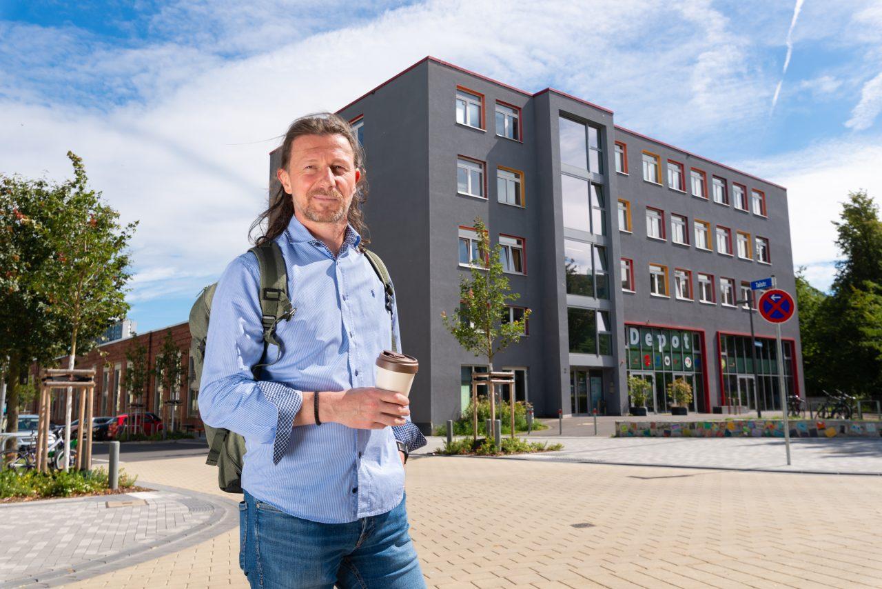 Der Verkehrsplaner Armin Langweg erklärt das Konzept von "Innenstadtmobilität für morgen" bei einem Stadtspaziergang.